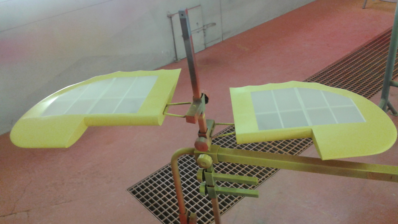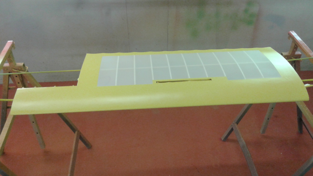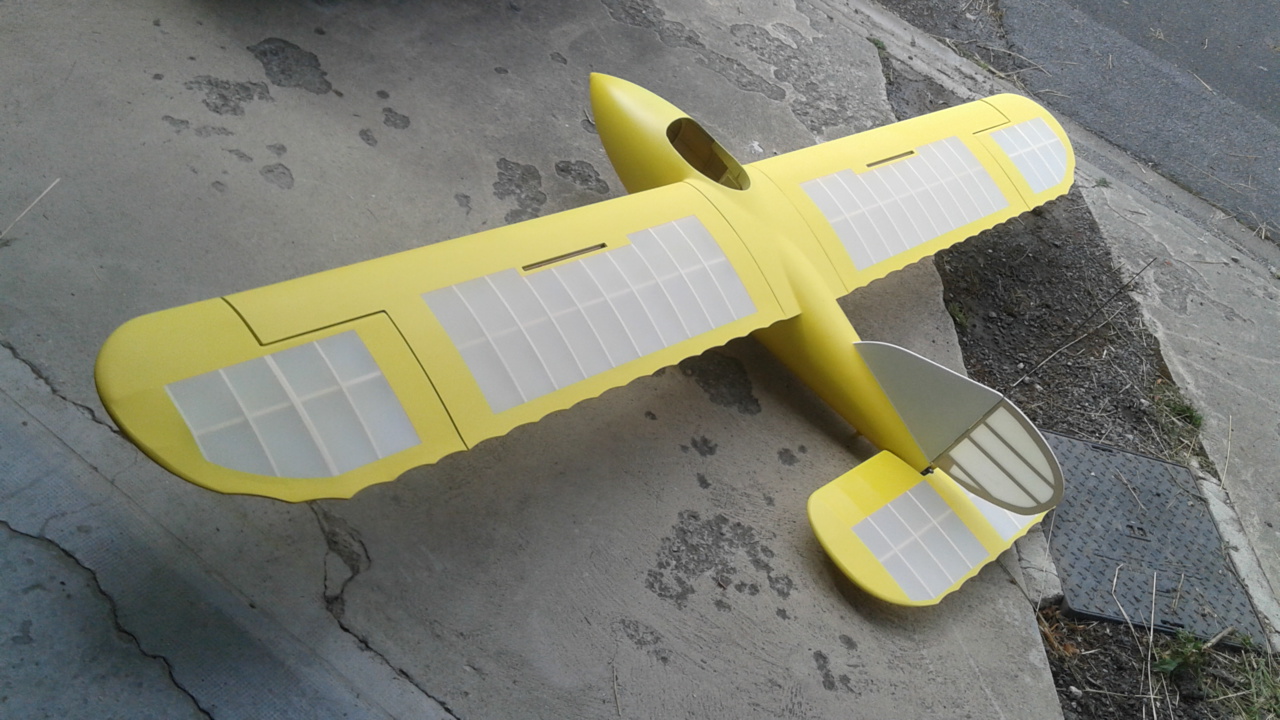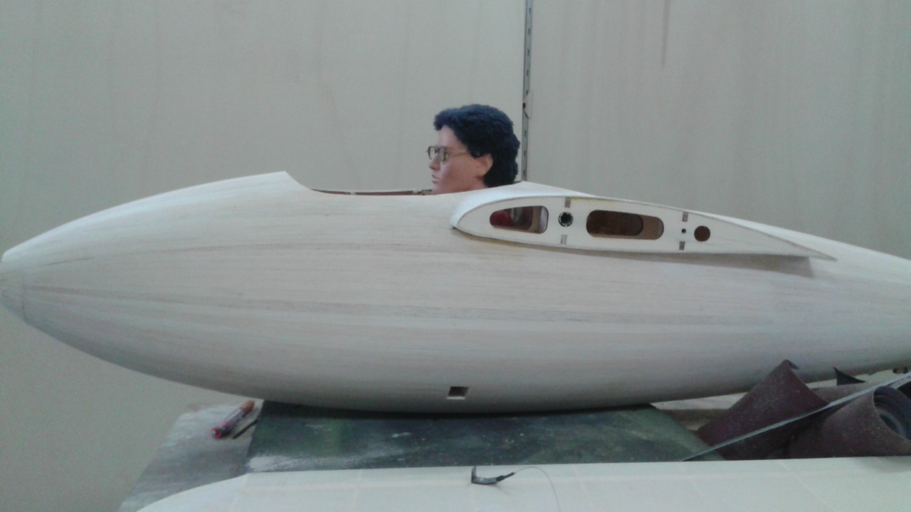 Coffrage complet du fuselage, finition des ailes,stab et peinture.Les ailes,dérive et stab sont entoilés au diacov.Le fuselage à été marouflé à la toile 39g/m2 puis apprêter.
