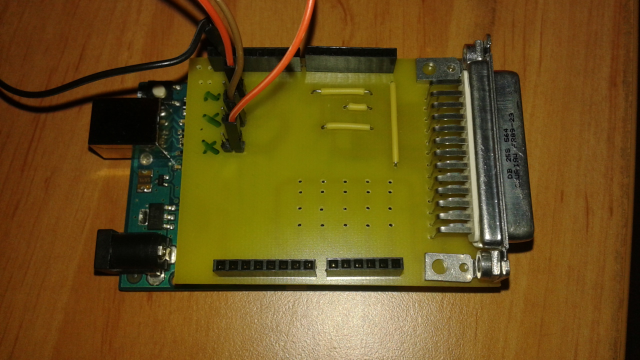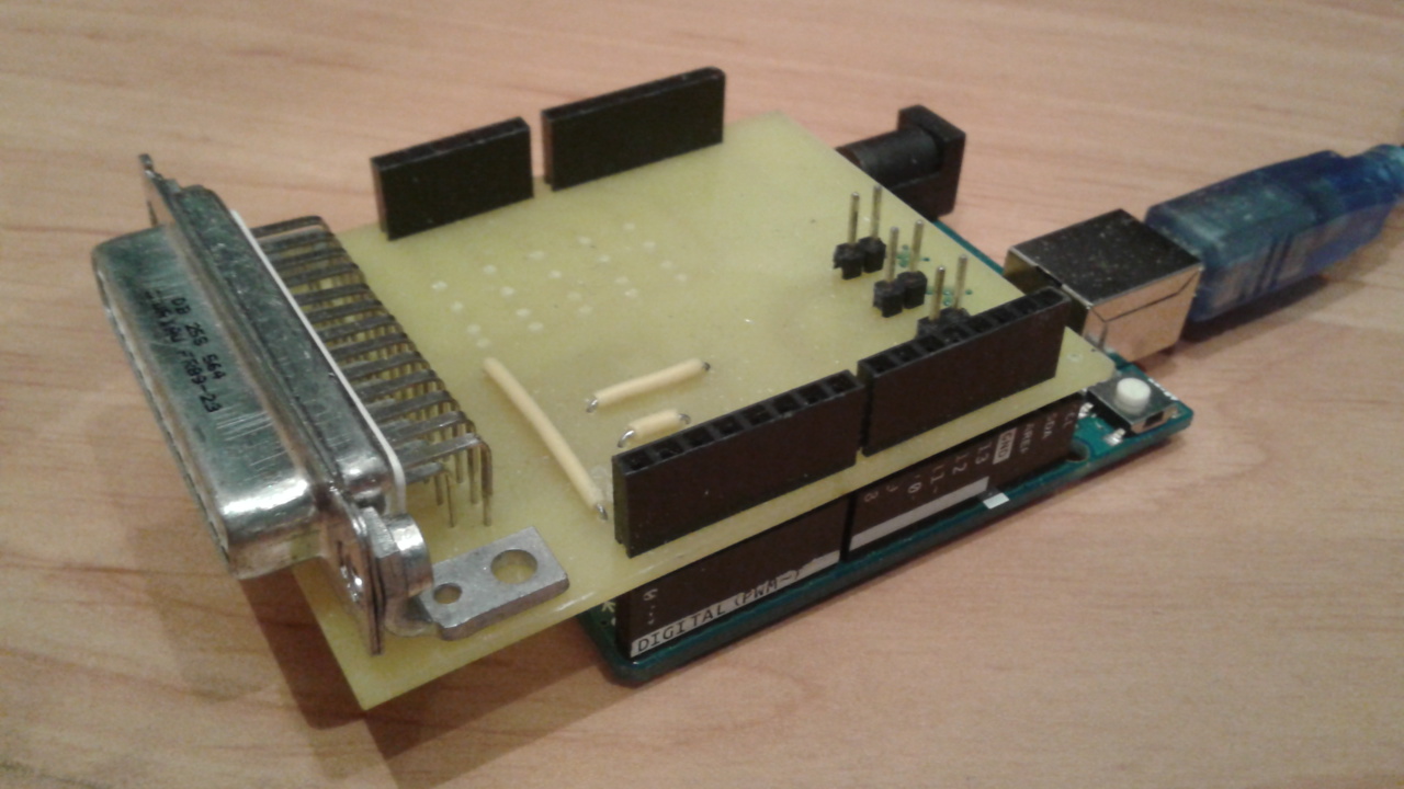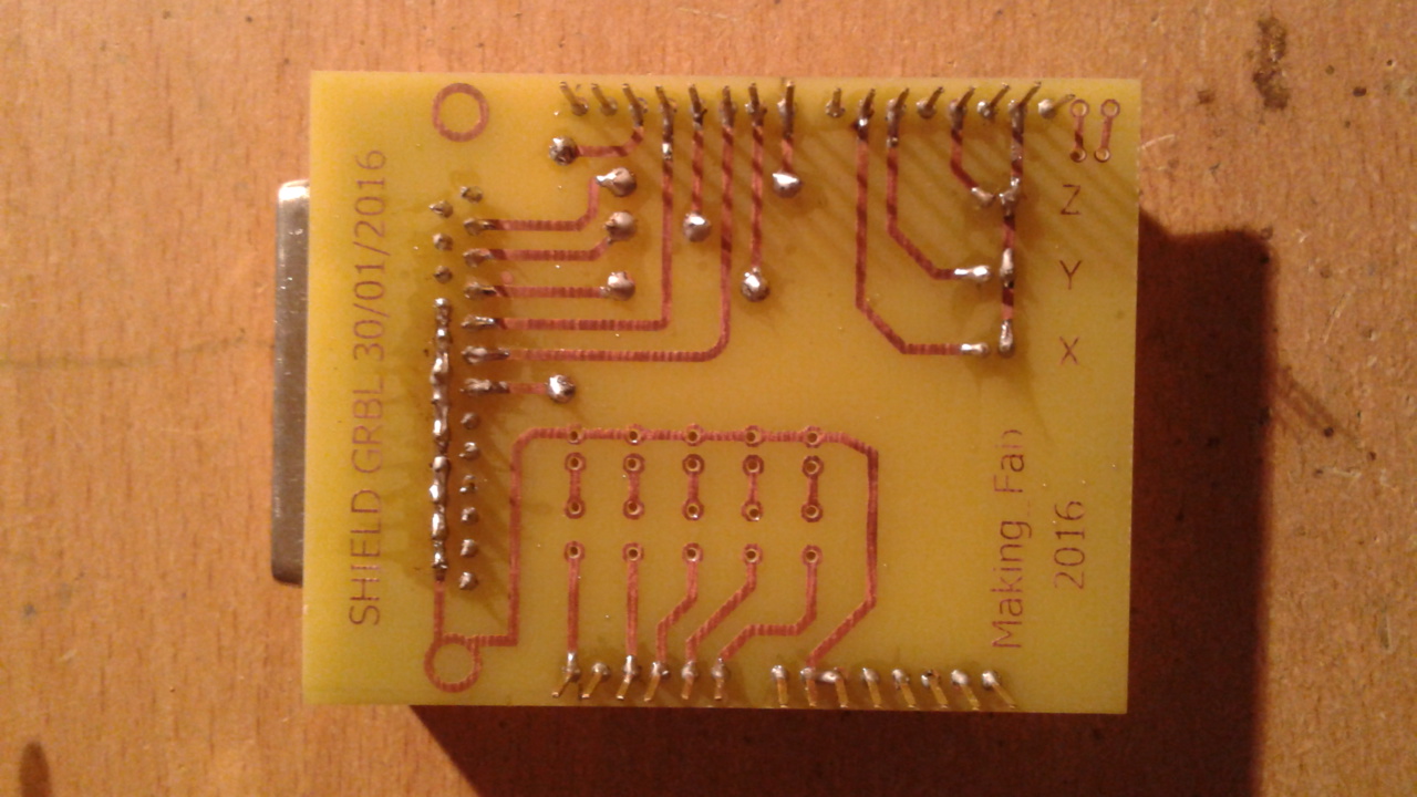 Voulant tester GRBL et possédant des interfaces pilotées autrefois en port parrallèle , j'ai réaliser un petit "shield" permettant le raccordement entre le UNO et la DB25. Le cablage de la DB25 est disponible ici Shield Schéma Typon