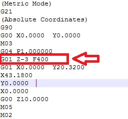 Le problème pourrais s'arrêter ici mais en générant le Gcode via le plugin , je me suis aperçut que la fraise ne descendait pas et la vitesse d'avance se trouvait à son minimum.Je propose donc de rajouter une ligne qui permettra d'indiquer la valeur de plongée et la vitesse d'avance de la fraise.On édite donc le fichier intitulé détourage(dessus ou dessous) et on insère une ligne :