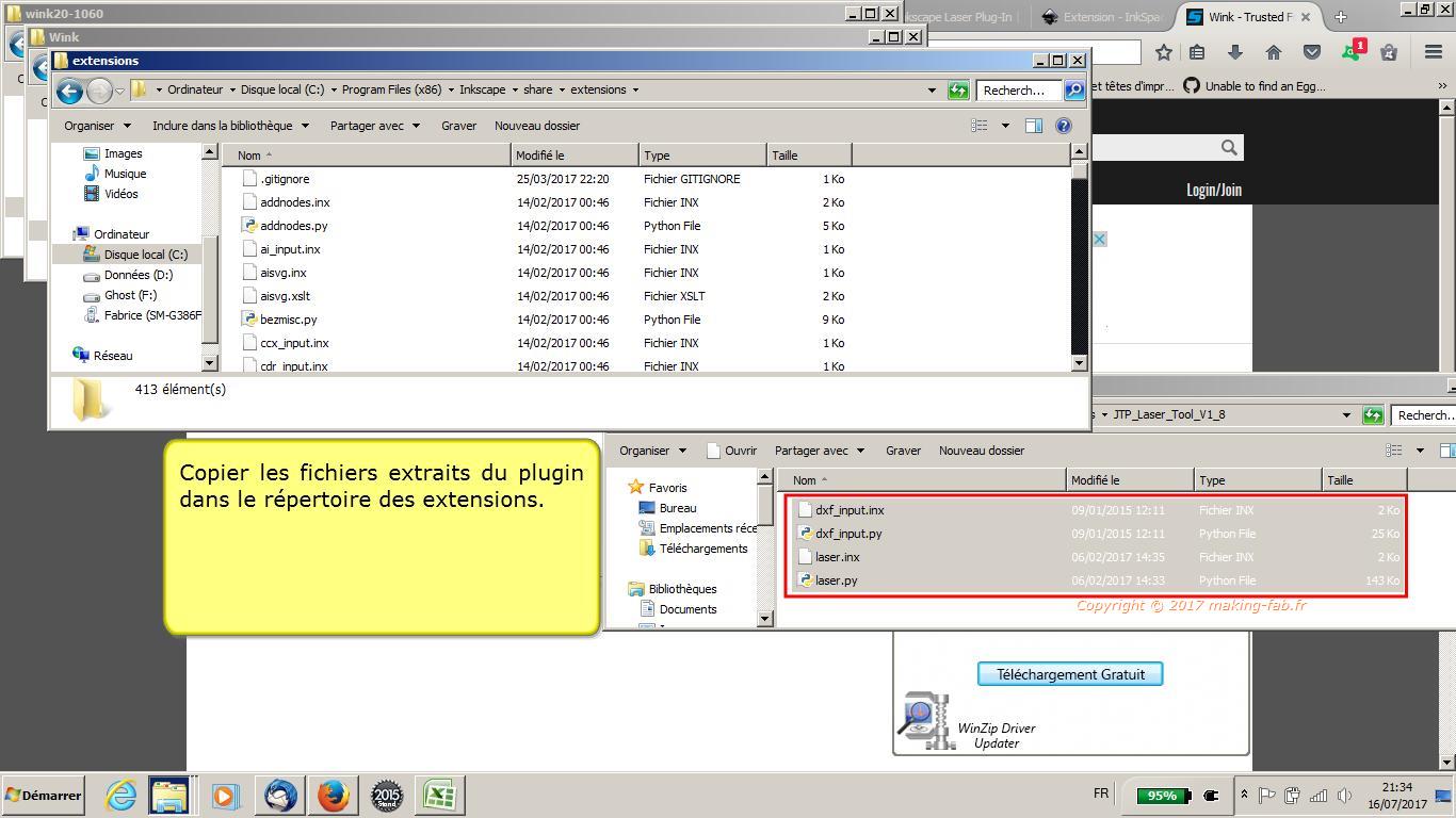 Dans un premier temps récupérer l'archive (.zip) de votre extension et extraire les fichiers .py et .inx.