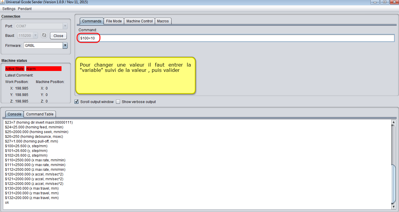 $100=26.600 (x, step/mm) ==> Nb de pas /mm axe x